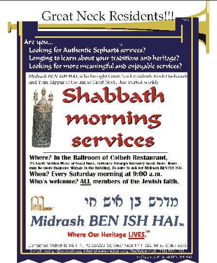 ![]() Mr. Hillel Shohet, whose dedication and assistance was a major factor in bringing Midrash BEN ISH HAI’s weekly prayer services in Great Neck to fruition With gratitude to Providence, the Great Neck, NY branch of Midrash BEN ISH HAI is witnessing substantial growth. Shabbath services every week are now held by the Midrash in Great Neck, as well as classes, lectures and community functions for young and old. Our sincere thanks go out to all those who have helped