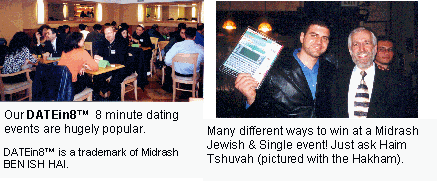 The Jewish & Single division of Midrash BEN ISH HAI has quickly become a beacon for young Jewish singles to veer to. While mainly populated by Sephardi singles of many varied backgrounds, including Syrian, Egyptian, Iraqi, Lebanese, Persian, Moroccan, Turkish and others, many Ashkenazim are now attending its events as its reputation spreads rapidly. Its many activities include weekend retreats, dinners, lectures, DATEin8™ as well as many other activities geared towards bringing Jewish Singles together. The hard working members of the singles committee always say that every wedding they attend, of a couple who met at one of the Midrash events, makes them feel that the long hours are well worth it.