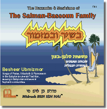 This exclusive Midrash BEN ISH HAI presentation provides a rare and golden opportunity to own a selection, on CD, of authentic pizmnonim and music for different occasions, Shabbath, Weddings, holidays and joyous occasions. It is of great interest to all Sephardim & Ashkenazim who enjoy and are interested in the authentic Sephardi culture and tradition which is part of the rich tapestry of the Jewish religion. This CD is a new recording of the large well-known musical Salman-Bassoun family who hail from Iraq and now live in the land of Israel. It is a golden opportunity to buy a rare and beautiful recording of this nature for you as well as for your friends and family. Available now for